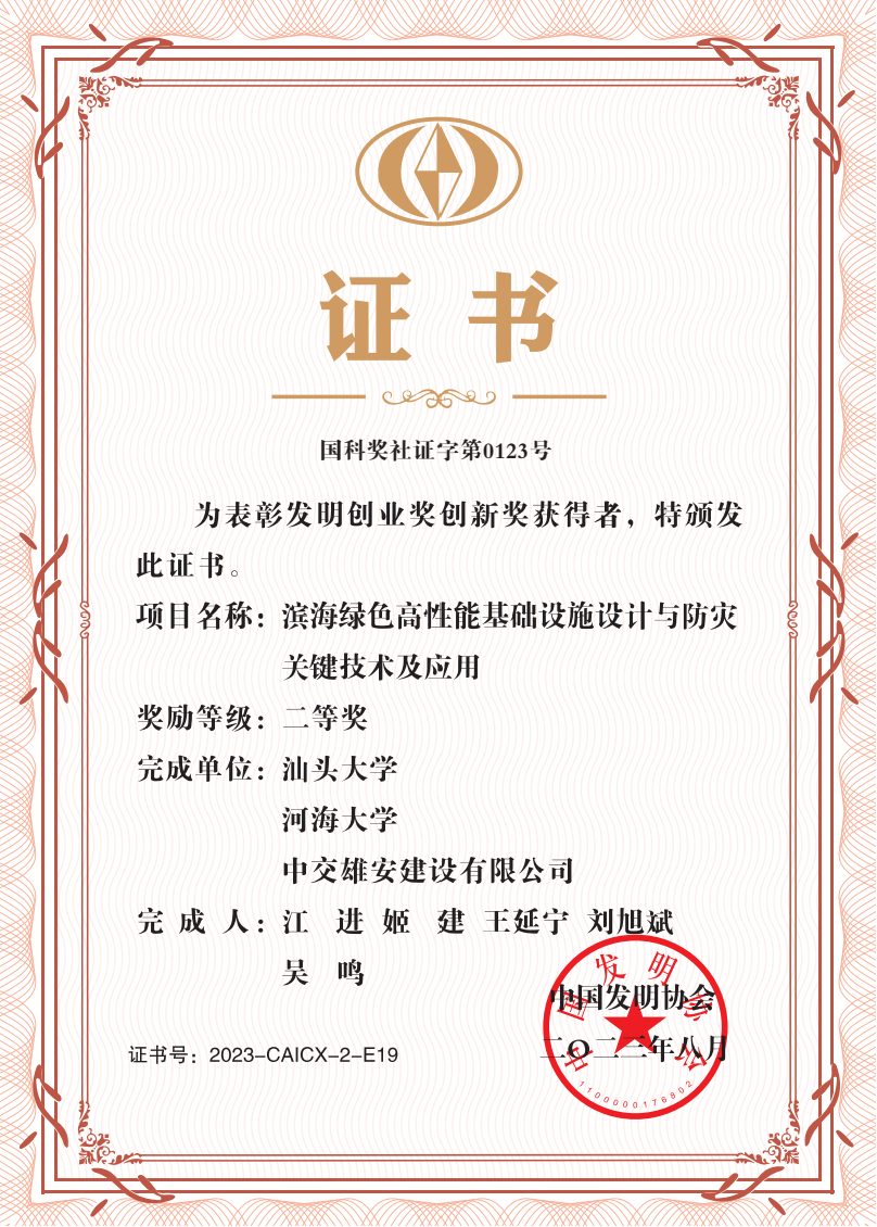 近日,中国发明协会公布了2023年度发明创业奖创新奖名单,由伟德国际victor1946江进副教授牵头申报的“滨海绿色高性能基础设施设计与防灾关键技术及应用”项目,荣获2023年度中国发明协会“发明创业奖创新奖”二等奖,江进...