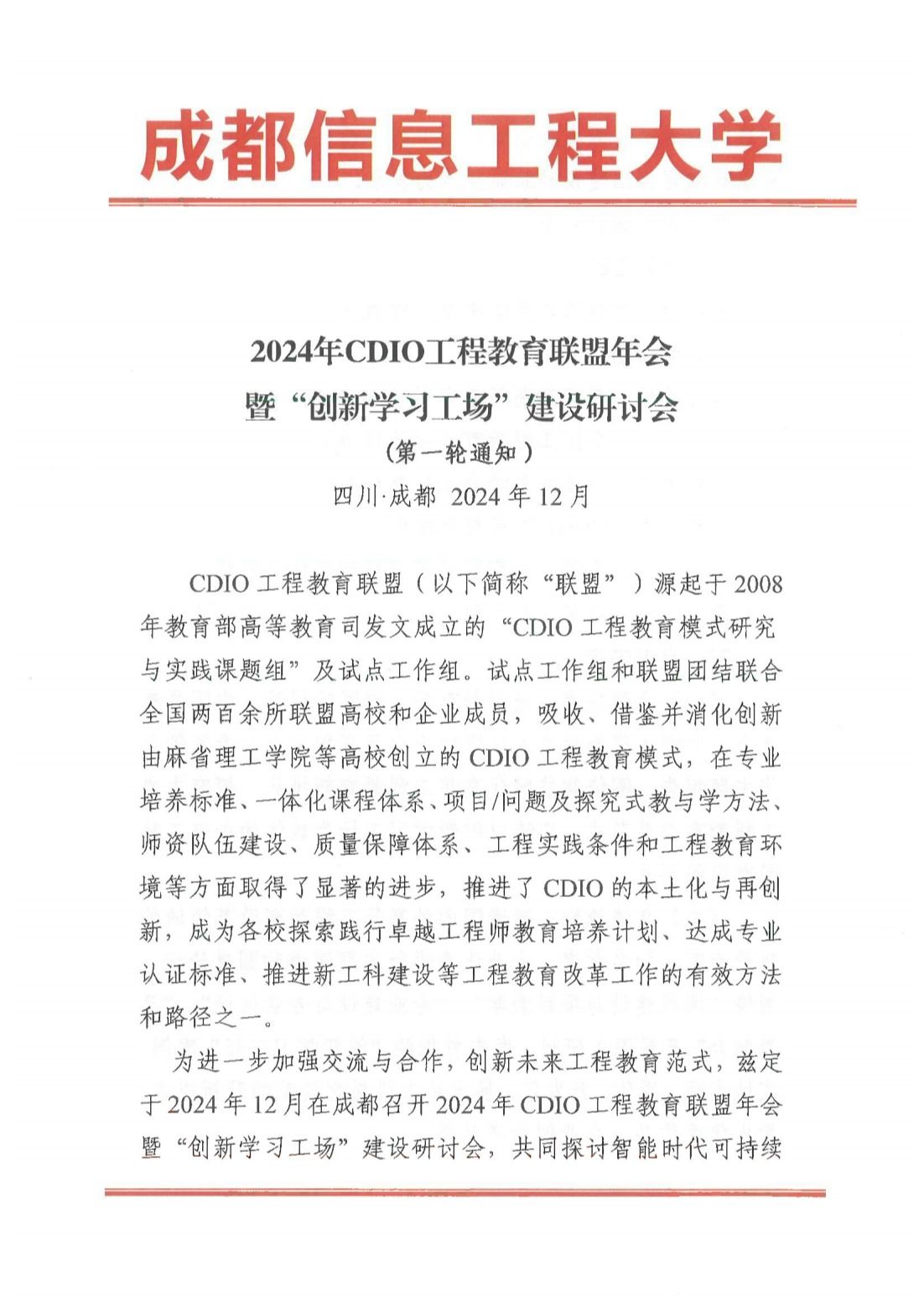 2024年CDIO工程教育联盟年会暨“创新学习工场”建设研讨会(第一轮通知) 2024-11-11 16:10:10