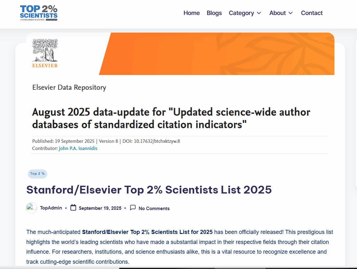 9月20日,美国斯坦福大学和爱思唯尔数据库(Elsevier Data Repository)发布第八版《年度全球前2%顶尖科学家榜单》(World’s Top 2% Scientists),根据其“生涯影响力”和“年度影响力”遴选出世界排名前2% 的...